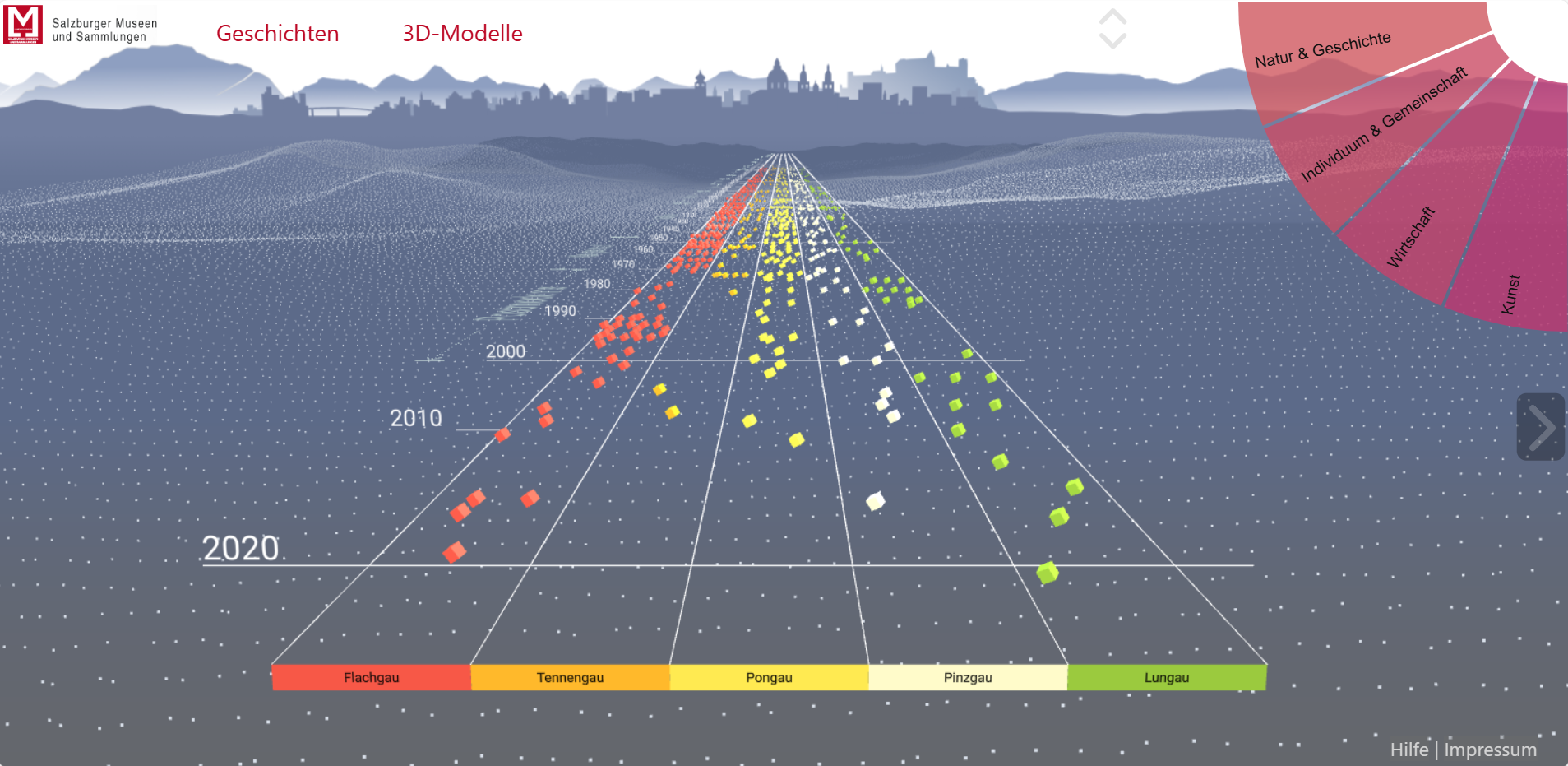 Die Benutzeroberfläche wurde bewusst einfach gestaltet, um einen niederschwelligen und intuitiven Zugang zu ermöglichen. Virtuelle Besucher*innen können sich am Zeitstrahl spielerisch auf Zeitreise durch die Salzburger Bezirke begeben, die Bestände thematisch oder museumsspezifisch erkunden oder einfach durch die Bildergalerie flanieren. Dabei kann jede*r selbst bestimmen, welche und wie viele Informationen mitgenommen werden.